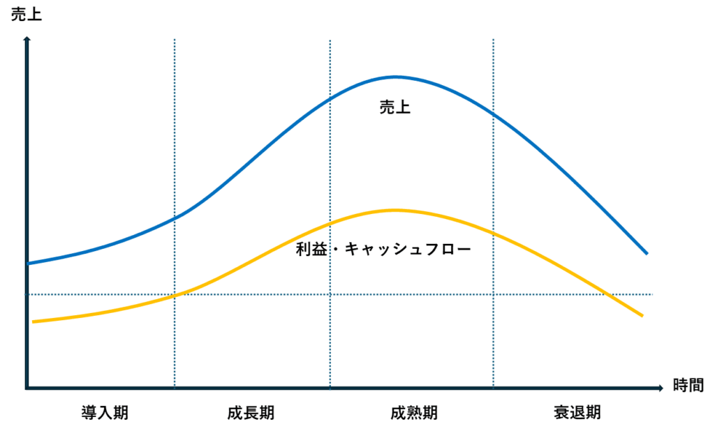 導入期では、製品の知名度が低く売上高は小さくなります。一方で、製品開発や市場投入の費用負担が大きく、一般的には利益は出ずに赤字となります。成長期では、競合企業も参入して市場が拡大し製品の知名度も高まるため、売上高は急上昇します。そして、利益が少しずつ出始めます。