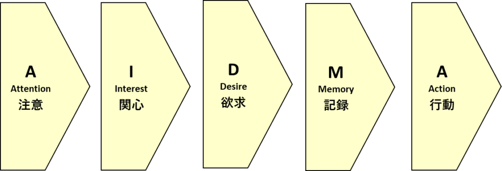 A(注意Attention)は、企業が顧客へ広告媒体・訪問販売・店舗を使って商品情報を提供し、顧客に商品を知ってもらうことです。I(関心Interest)は、企業が顧客へ商品の特長、顧客欲求を満たす点を提示し、商品への関心を持ってもらうことです。そして、D(欲求Desire)は、顧客が商品を買いたいと感じてもらうために、企業は顧客へ価格や支払条件など、お得感を演出することです。その上で、M(記録Memory)は、商品が顧客の記憶に深く刻まれることです。その後、顧客は他の商品との比較検討を経て、最終的に商品のA(購買行動Action)を起こします。