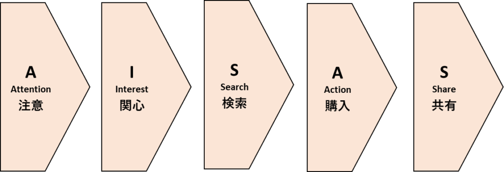 AISASは電通が考案したと言われていて、A(注意Attention)→I(関心Interest)→S(検索Search)→A(購入Action)→S(共有Share)で説明されます。現在ネットに接続されたPC・スマホ・タブレットが普及しているので、顧客が商品への関心を持てば、これらですぐに検索して商品情報を取得することができます。そして、ネット・ショッピングによって購入行動を起こすことが可能です。