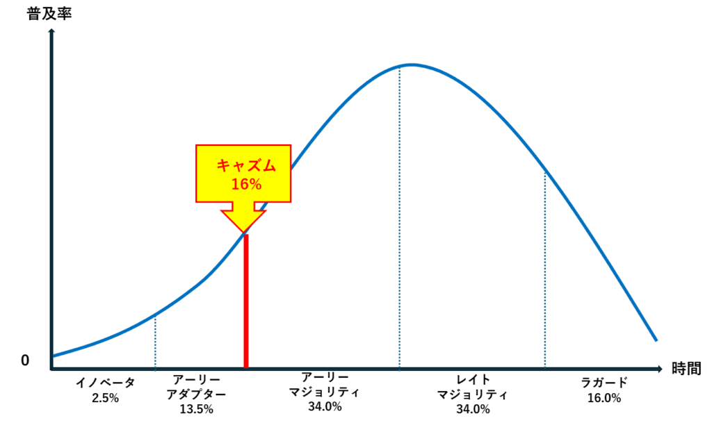 縦軸は普及率で横軸は時間の経過とすると、なだらかな山型の曲線を描きます。その普及は、5つの潜在的採用者で構成されます。イノベーター(2.5%)は、新しく珍しいものが好きで自分の生活様式を変えるのに積極的である反面、すぐに別の物に関心が移ります。アーリーアダプター(13.5%)は、一般大衆との価値観の乖離が小さく、イノベーションが社会全体に適合的か否かを判断する役割であるオピニオン・リーダーを担います。これらを合計すると16%(普及率16%の壁・キャズム理論)となり、これを超えるとS字カーブが急激に上昇して普及が進みます。しかし、このキャズムを超えるのは難しいと言われています。